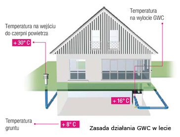 Zasada działania GWC polega na pobraniu powietrza przez czerpnię a następnie przeprowadzaniu przez filtr zgrubny lub drobny gdzie zatrzymywany jest kurz i pył. Drugi etap opiera się na przejściu powietrza przez wymiennik, w którym następuje jego ocieplenie lub schłodzenie. System kolektorów jest ułożony w gruncie na głębokości ok. 1,5-2,5m. Temperatura w wymienniku niezależnie od pory roku oscyluje wokół 8oC. Po przebyciu drogi wymiennika powietrze o zmienionej temperaturze trafia do centrali wentylacyjnej, z której powietrze rozprowadzane jest do poszczególnych pomieszczeń. Zastosowanie rekuperacji przy wentylacji mechanicznej pozwala przed rozprowadzaniem powietrza po budynku na dodatkowe ogrzanie dzięki ciepłu pochodzącemu od powietrza usuwanego.